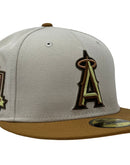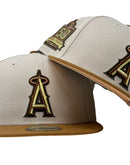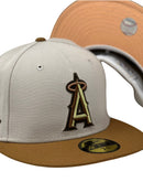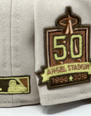 Presenting an exclusive Los Angeles Angels 50th anniversary custom New Era fitted hat from Sports World. 59Fifty high crown cap. It features all stone color crown with light bronze visor.