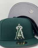 Presenting a classic Los Angeles Angels cap in dark green. front logo in white. MLB batter man in the back. white new era flag on right mid panel. gray under visor. black sweat band. 100 percent polyester.