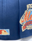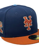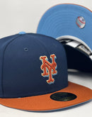 Presenting a custom New York Mets New Era fitted hat exclusively from Sports World. 59fifty high crown color cap. it features an all-light navy color cap rust orange. front logo in rust orange with sky blue and toast outline. 40th anniversary side patch on left mid panel in rust, sky blue and toast. tonal new era flag on right mid panel. Flat MLB batter man in the back. sky blue under visor. white sweat band. 100 percent polyester. imported from China.