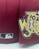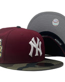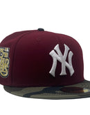 Introducing a unique custom New York Yankees 1978 world series New Era fitted hat from Sports World. The 59Fifty high crown fitted hat is designed with a sleek all burgundy color cap with a woodland camouflage visor that provides a bold contrast to the classic design.