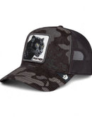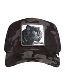 Black trucker cap with a bold panther patch, corduroy front, and camo detailing.