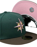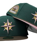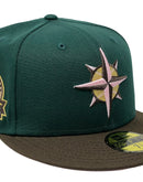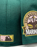 Presenting an exclusive Seattle Mariners 30th anniversary pink brim New Era fitted only from Sports World. 59Fifty high crown cap. It features an all-green color cap. front Compass logo in brown and pink. Baseball in metallic gold with brown outline. 30th anniversary side patch on left mid panel in brown, beige, pink and white. tonal new era flag on right mid panel. flat MLB batter man in the back. pink under visor. white sweat band. 100 percent polyester. Imported from China.