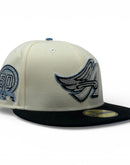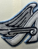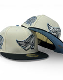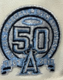 Introducing a unique custom throwback Angels 50th anniversary icy brim New Era fitted hat from Sports World. The 59Fifty high crown fitted hat is designed with a sleek all off white color cap with black visor that provides a bold contrast to the classic design.