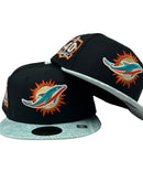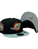 Introducing a unique custom Miami Dolphins 40th anniversary New Era fitted hat from Sports World. The 59Fifty high crown fitted hat is designed with a sleek all black color cap with a clear mint paisley visor that provides a bold contrast to the classic design.