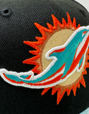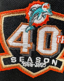 Introducing a unique custom Miami Dolphins 40th anniversary New Era fitted hat from Sports World. The 59Fifty high crown fitted hat is designed with a sleek all black color cap...