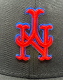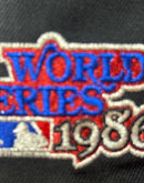 This 59Fifty high crown cap features a unique and stylish design, with an all-black color cap. The front upside-down logo is in metallic red with metallic royal. The 1986 world series side patch on the left mid-panel adds a special touch to the hat, while the tonal New Era flag on the right mid-panel completes the design.