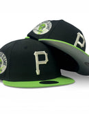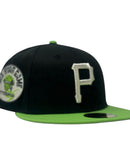 Introducing a unique custom Pittsburgh Pirates 1974 All-star Game New Era fitted hat from Sports World. The 59Fifty high crown fitted hat is designed with a sleek all black color cap with lime green visor.
