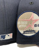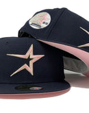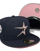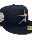 Represent your team with Dark Navy Houston Astros 35th Anniversary custom new era fitted hat from sports world. 59Fifty high crown and pink under visor. Front logo in light pink with metallic silver outline. 35th anniversary side patch in metallic silver, pink, white. White sweat band. 100 percent polyester. Imported from Bangladesh.