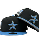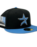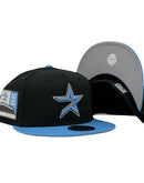 Introducing a unique custom Houston Astros 2000 inaugural season gray rim New Era fitted hat from Sports World. The 59Fifty high crown fitted hat is designed with a sleek all black color cap with a sky-blue visor that provides a bold contrast to the classic design.