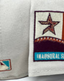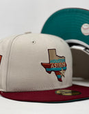 Presenting an exclusive custom Houston Astros 2000 inaugural season New Era fitted hat. it features an all-off white color crown with burgundy visor. front State map logo in burgundy, teal and toast.  2000 inaugural season side patch on left mid panel. Tonal new era flag on right mid panel. flat MLB batter man in the back. teal under visor. white sweat band. 100 percent polyester. imported from China.