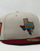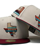 Presenting an exclusive custom Houston Astros 2000 inaugural season New Era fitted hat. it features an all-off white color crown with burgundy visor. front State map logo in burgundy, teal...