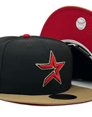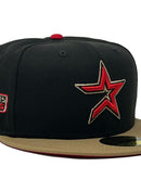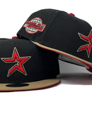 Presenting an exclusive Houston Astros 2005 world series new era fitted hat only from Sports World. 59Fifty high crown cap.  It features all black color cap with camel visor. Front Astros logo in red with black and toast outline. 2005 world series side patch in black, camel and red. tonal new era flag on right mid panel. flat MLB batter man in the back. red under visor. White sweat band. 100 percent polyester. Imported from Bangladesh.