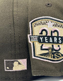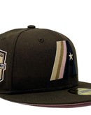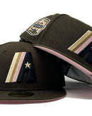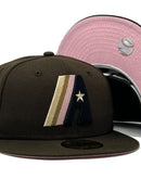 Presenting an exclusive Houston Astros 20th anniversary New Era fitted hat from sports world. 59Fifty high crown cap. It features an all-brown color cap. Front Prototype Astros logo in black, light pink, gold. 20th anniversary side patch on left mid panel. tonal new era flag on right mid panel. flat MLB batter man in the back. pink under visor. white sweat band. 100 percent polyester. imported from China