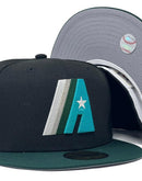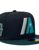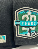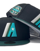 Presenting an exclusive Houston Astros 20th Anniversary Prototype Logo new era fitted hat only from Sports World. 59Fifty high crown cap.  It features all black color cap with dark green visor. Front Astros Prototype logo in teal, green, white and metallic silver. 20th anniversary side patch in black, green and white with metallic silver outline. light gray under visor. White sweat band. 100 percent polyester. Imported from China.
