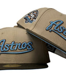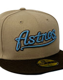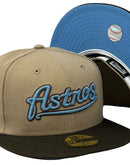 Presenting a custom script Houston Astros 45th anniversary New Era fitted hat from Sports World. 59fifty high crown cap. it features an all-camel color cap with brown visor. front logo in sky blue with brown outline. 45th anniversary side patch on left mid panel in brown, toast, sky blue with white outline. tonal new era flag on right mid panel. Flat MLB batter man in the back. sky blue under visor. white sweat band. 100 percent polyester. imported from China.
