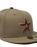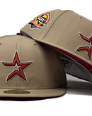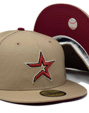 Presenting an exclusive custom Houston Astros 45th anniversary New Era fitted hat only from Sports World. 59Fifty high crown cap. It features all camel color cap. Front logo in team original colorway burgundy with black and camel outline. 45th anniversary side patch on left mid panel. tonal new era flag on right mid panel. MLB batter man in the back. Burgundy under visor. white sweat band. 100 percent polyester. imported from China.