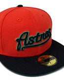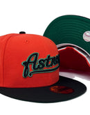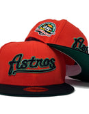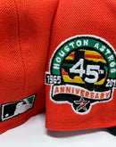Presenting an exclusive custom New Era fitted hat from Sports World. 59fifty high crown cap. it features an all-orange color crown with black. front logo black with green outline. 45th anniversary side patch on left mid panel. tonal new era flag on right mid panel. Flat MLB batter man in the back. green under visor. white sweat band. 100 percent polyester. imported from China.