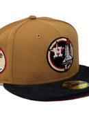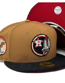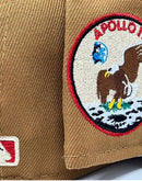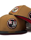 Presenting a custom Houston Astros New Era fitted hat exclusive from Sports World. 59fifty high crown cap. it features an all-bronze color crown with black cord visor. front logo in black, red, white and gold outline. Apollo 11 side patch on left mid panel. tonal new era flag on right mid panel. Flat MLB batter man in the back. red under visor. white sweat band. crown is 100 percent polyester visor in 100 percent cotton. imported from Bangladesh.