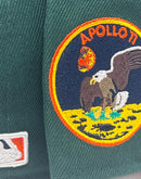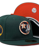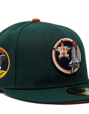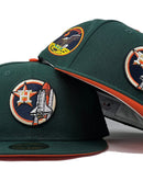 Presenting a custom Houston Astros New Era fitted hat exclusively from Sports World. 59fifty high crown cap. it features all dark green color cap. front logo in black, Vegas gold, navy and orange. Apollo 11 side patch on left mid panel. tonal new era flag on right mid panel. Flat MLB batter man in the back. orange under visor. white sweat band. 100 percent polyester. imported from China.