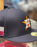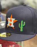 Represent your team with Navy Blue Houston Astros MLB Crystal Icons exclusive release by New Era. 59Fifty high crown cap and gray under visor. Team original logo in front. Cactus logo in crystal. State map in crystal. Black sweat band. 100 percent polyester.