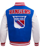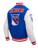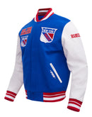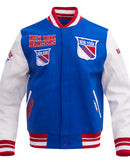 Showcase your New York Rangers pride by sporting this Retro Classic Full-Zip Varsity Jacket from Pro Standard. Its timeless design features faux leather sleeves in a team color and vintage patches on all sides to make a strong statement about your loyalty. Crafted from a blend of premium materials, including wool for warmth, this New York Rangers jacket is designed to