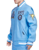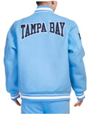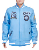 The Tampa Bay Rays Crest Emblem takes center stage on this varsity jacket, featuring a heat-sealed appliqué with raised embroidered detail for a bold and textured look. The heat-sealed felt appliqué with chenille detail adds a tactile element, creating a standout emblem that proudly represents your team spirit.