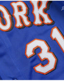 100% Poly mesh body; layered twill; woven cooperstown jocktag; self fabric name/ yr player ID label, button placket; knit rib sleeves and neck.