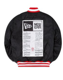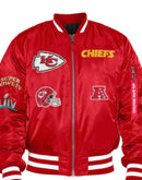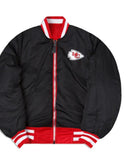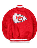 The Alpha Industries X Kansas City Chiefs MA-1 Bomber Jacket features embroidered Chiefs patches throughout the chest and sleeves with an embroidered applique team wordmark at the rear. Additional details include a utility pocket with the Alpha Industries ribbon at the left sleeve. The reversible jacket features a black interior with a screen-printed team logo at the left chest and a multi-lingual message at the rear.