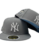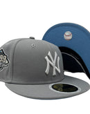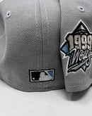 Presenting an exclusive New Era fitted hat for kids. it features all light gray color cap. Front logo in white. 1999 world series side patch on left mid panel. White new era flag on right mid panel. Flat MLB Batterman in the back. Sky Blue under visor. black sweat band. 100 percent polyester. imported from Bangladesh.