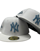 Presenting an exclusive New Era fitted hat for kids. it features all white color cap. Front logo in sky blue. 2001 world series side patch on left mid panel. White new era flag on right mid panel. Flat MLB Batterman in the back. Gray under visor. black sweat band. 100 percent polyester. imported from Bangladesh.