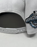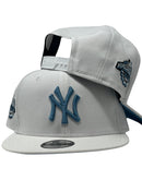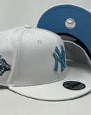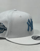 Presenting an exclusive New Era snapback hat for kids. One size fits most youth. it features all white color cap. Front logo in sky blue. 2001 world series side patch on left mid panel. tonal white new era flag on right mid panel. adjustable white bar tack in the back. sky blue under visor. black sweat band. 100 percent polyester. imported from Bangladesh.