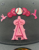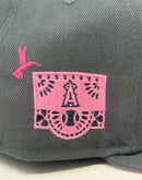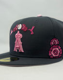 The Angels Day of the Dead Graphite 59FIFTY Fitted Cap features an embroidered Angels logo at the front panels with marigold (cempasúchil) and hummingbird designs throughout, representing the Legend of Xóchitl and Huitzilin. Additional details include a team patch at the right-wear side and a matching MLB Batterman logo at the rear.