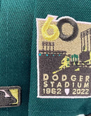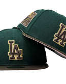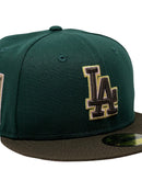 Presenting an exclusive custom "Los Angeles Dodgers" 60th anniversary New Era fitted hat only from Sports world. 59Fifty high crown cap. it features an all-dark green color crown with brown visor. front logo in brown with pink and metallic gold outline. 60th anniversary side patch left mid panel. tonal new era flag on right mid panel. flat MLB batter man in the back. pink under visor. white sweat band. 100 percent polyester. imported from China.
