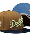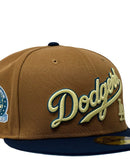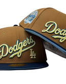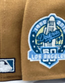 Presenting an exclusive custom "Los Angeles Dodgers 60th anniversary New Era fitted hat only from Sports world. 59Fifty high crown cap. it features an all light bronze color crown with navy blue visor. front script Dodgers logo in Vegas gold with navy outline. 60th anniversary side patch left mid panel. tonal new era flag on right mid panel. flat MLB batter man in the back. sky blue under visor. white sweat band. 100 percent polyester. imported from Laos.