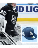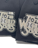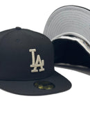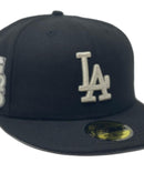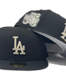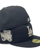 Custom new era fitted hat inspired by old school Los Angeles kings colorway. all black cap. front logo in metallic silver. 75th world series side patch in metallic silver with black outline. Flat MLB batter man in the back. metallic silver under visor. white sweat band. It features 100 percent wool.