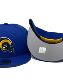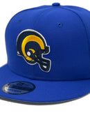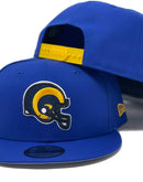 Representing Yellow Los Angeles Rams Super Bowl Team with a New Era snapback hat. It features an all royal blue color cap. Team old school logo in front. Yellow snapback. Gray under visor. Black sweat band.