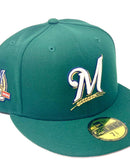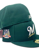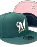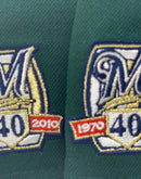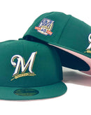 Custom new era cap. all dark green cap. front logo in team original color/ 40th season side patch. Matching flat MLB batter man in the back. pink under visor. black sweat band. it features 100 percent polyester.