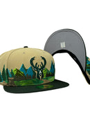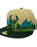Introducing a unique custom Milwaukee Bucks "Mountain Pack" gray rim New Era fitted hat from Sports World. The 59Fifty high crown fitted hat is designed with a sleek all Vegas gold color cap with an olive-green visor that provides a bold contrast to the classic design.