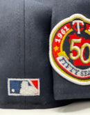 Introducing a unique custom Minnesota Twins 50th anniversary gray brim New Era fitted hat from Sports World. The 59Fifty high crown fitted hat is designed with a sleek all navy-blue...