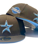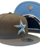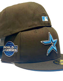 Custom new era fitted hat. all brown cap. front logo in sky blue with white outline. 2005 world series side patch in sky blue. matching MLB batter man in the back. sky blue under visor. white sweat band.