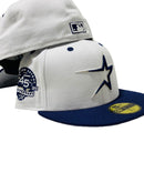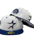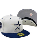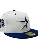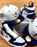Custom new era fitted to match Jordan 1. all white cap with bright navy visor. front logo in navy with metallic silver outline. 45th anniversary side patch. matching MLB batter man in the back. gray under visor. black sweat band.