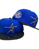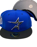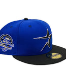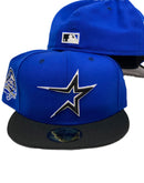 Custom new era fitted hat. all royal blue cap with black visor. front logo in black with white outline. gray under visor.