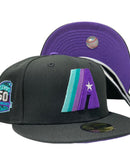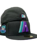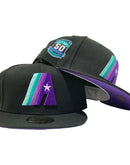 custom new era fitted. all black cap. 50th anniversary side patch. purple under visor. white sweat band. matching MLB logo in the back.