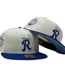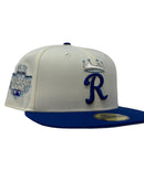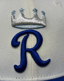Dedicated to commemorating the illustrious 2012 All Star Game journey of the Kansas City Royals, this fitted encapsulates the essence of the team's legacy. The all-off white color cap with light royal blue visor. Front logo in royal blue. Crown in metallic silver with black outline.  Adorning the left mid-panel is the iconic 2012 All star game side patch, a testament to challenges, and unforgettable moments in Royal's history.