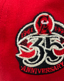 The front logo in metallic silver and metallic black outline is the perfect representation of the team, giving it a modern and stylish appeal that any Angels fan would love. Halo in white. 35th anniversary side patch on the left mid-panel adds a unique touch to the design, commemorating a special moment in the team's history.