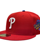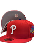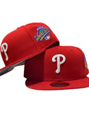 Custom new era fitted. All red cap. 1993 world series side patch. gray under visor.