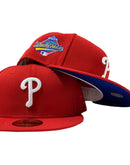 Custom new era fitted. all red cap. 1993 world series side patch. royal under visor.
