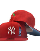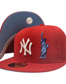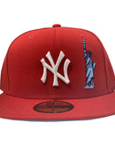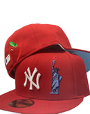 All red new era fitted. icy blue statue liberty logo. icy under visor. Red-apple logo on the back. white sweatband.