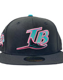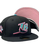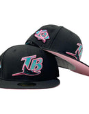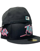 Custom new era fitted. 10th season side patch. all black cap. pink under visor. white sweatband. matching MLB logo man in the back.