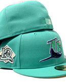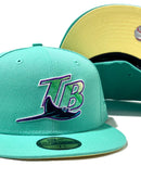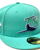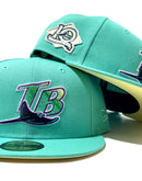 custom made new era fitted. all bright turquoise cap. 10th season side patch. soft yellow under visor. black sweat band. Matching MLB batter man in the back.